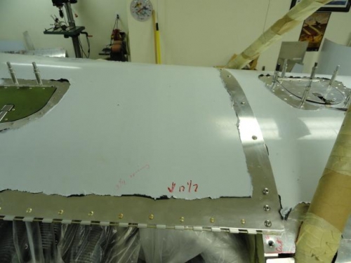 Hinge line for Top Cowl Panel: drilled to size and riveted left hinge; drilled for and installed nut plates to top of firewall flange to accept top cowl panel. Installed to mock fit. The lower cowl was fabricated from 2024 and made a good fit except for the lower firewall flange attach points. The cowl puckered and 2024 is too hard to form a tight fitting lip. So, I acquired some 3003H13 and made a second lower cowl using the first as a pattern. Match drilled to lower firewall flange.