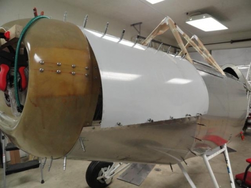 I had built up the hinged cowl doors from .025 20024, but thought maybe .032 might be better. So, I matched drilled new left door and clecoed in place. Will take some trimming.