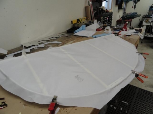 Begin covering process. Started with the rudder.