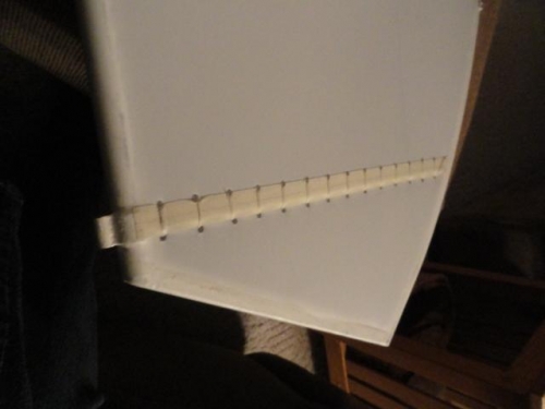 Laid out holes around and along ribs in Right Horizontal stabilizers by heat forming holes with electric soldering iron; Began stiching at 1 inch intervals using Superflites hidden knot method. Finished right stab.Ready for tape.