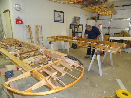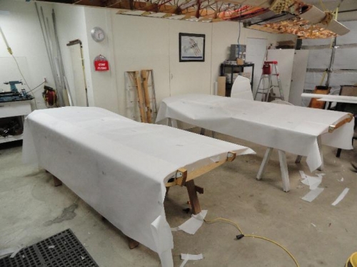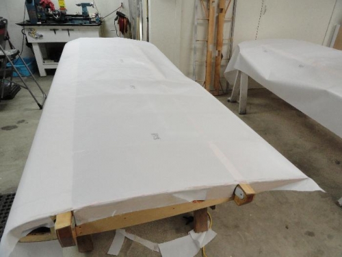 Routed overhang of leading edge material flush with rear of spar; filed with radius; finish prep work on lower wings; Applied two coats of adhesive thinned 2:1 per direction; layed out underside of wing fabric; glued butt end