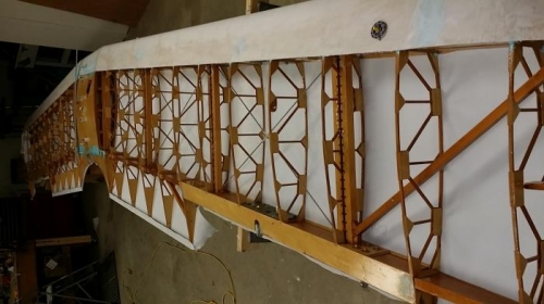 trimming an prepping fabric over upper part of upper wing.Iron glued areas; begin shrinking of wing tips