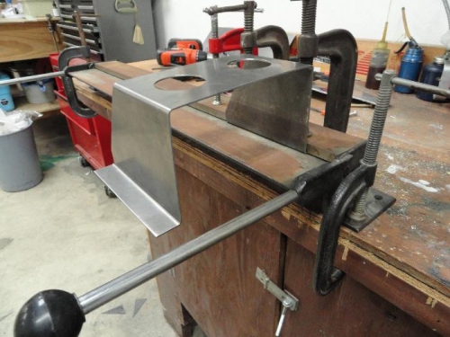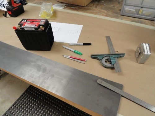 Since I have dual electronic ignition, I have to have a second battery as a back up in the event that the main, much bigger, battery should fail. I bought a 12 lb Odyssey 535 batter to do this. I deceided to mount on the fire wall because it is about the only location it will fit and have convenient acces for charging. I made a drawing that allows for 1/4 clearance all around to allow some cushion material. So, I bought some .063 sheet steel and cut out the initial main piece. .063 is overkill. Should have used .050. Made the base to be welded to the main box, but decided to use some .050 for that. Because I am adding about 13 lbs to the firewall, I made a 8 x13 plate from .070 3003 alum plate I had laying around. The plate will serve as a backer and will be attached to the vertical tube and the angle tube by 6 cushion clamps. This should tie the box into the steel tubing.