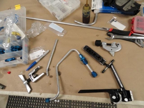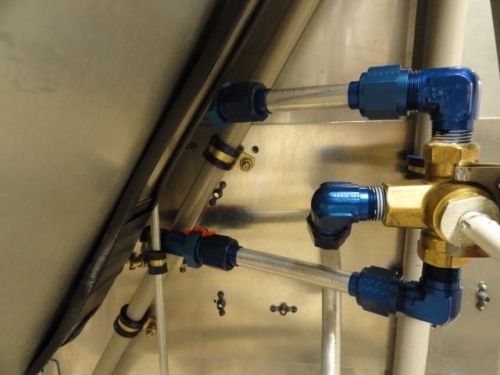 Made up fuel line from wing/aux tank to fuel valve. I terminated the line at the right front cabane leg. Still need to do clamping of lines. Also, made up fuel tank drain line.