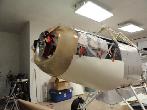 The first pattern was far from satisfactory, so I used some butcher paper, which worked poorly. So, I went back to the first pattern and cut and pasted patches to match radii along nose bowl and firewall. I then cut and trimmed that pattern. I used it to make pattern #2 and it worked very well. I clamped in place and trimmed to fit for the making of aluminum lower nose cowl.
