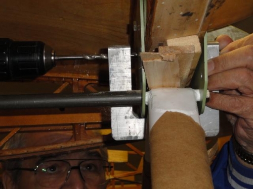 Drilled spar with a tool milled from solid stock shaped like a horse shoe with drill and guide bushings in alignment.