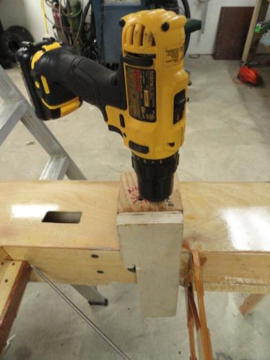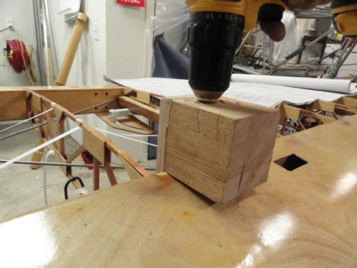 Made drill jig to drill front and rear spars for I strut attachment from oak block. Installed drill bushings; laid out hole posiitions per plans; began drilling spars for I struts