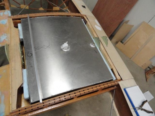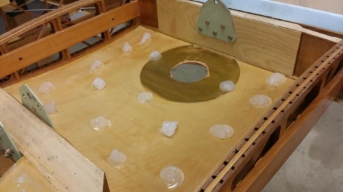 zInstalled center section fuel tank in the upper wing. I applied 10 or 12 dollups of clear pure silicone and while still wet, set the tank in and pushed down to make sure all areas of tank surface made contact; installed foam and affixed in place with silicone adhesive. Installed 5 nut plates in LE to attache the LE of the canoe.