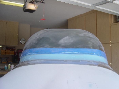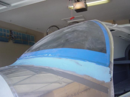 Sanded the black cabosil/epoxy mixture I applied flush with the fineline tape. I'm not sure it's 100% effective, as when looking through the windscreen from inside I can see light at the boundaries where the 'black' is very thin, but at least it should help darken everything, and after primer and paint are applied I think it will be fairly 'black'. I pulled off the fineline tape, as it had gotten chewed up in a couple of places while sanding and applied 3 layers of new tape. After I get the finshcoat on, I'll feather the edges by pulling off 1 layer of tape at a time and then hand feathering it in until I get to the last layer. I thought I would be able to go directly to the METAL GLAZE, but when I held up my 8" radius template (.032") I discovered that the gap at the widest part was MUCH more than 1/16" . so I need to build the area up before going to the metal glaze. I used SuperFil and applied it along the bottom of the windscreen, and then used the 8" radius template to screed/contour the surface. While it's not ready for final sanding after this as there are places where the SuperFill had some surface voids. It's better, I may come back out later after the Superfil has partially hardened and trowl some more into the remaining low spots. When it cures overnight it should be ready for Metal Glaze and final sanding tomorrow.