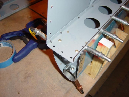 Riveted spar to nose ribs sfor Left Aileron and clecoed top skin, ready to rivet tomorrow.