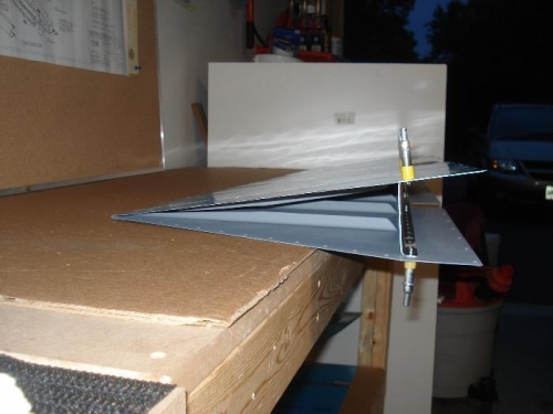 After the stiffeners were back riveted on the right elevator, the trailing edge was bent in the home made bender. A couple of bending stages and the required bend was achieved so that the leading edges sat on the spar.