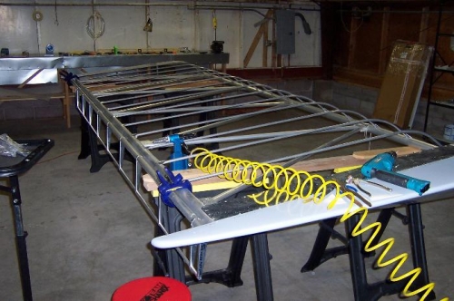 Installed wing fiberglass wing tips on left wing. Put vertical supports in place.