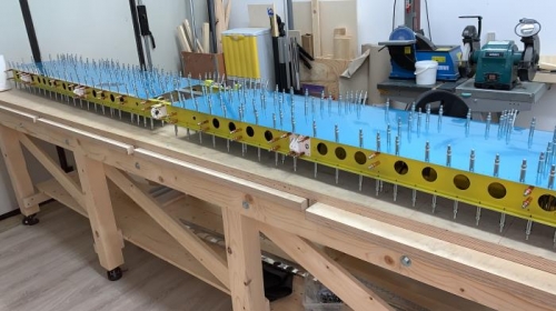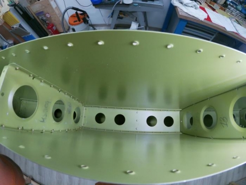 assembled inspar ribs to Stringer web assembly. Rivet inspar ribs to the structure using pneumatic squeezer inserted snap busing into 5/8" holes Manufactured Head of rivets OUTSIDE in order to have easier drill-out option in necessary as indicated in MIL-R-47196A(MI) (3.3.3.1 Head direction. Unless specified on the engineering drawing or specification, the manufactured head of the rivet shall be located on exterior surfaces.)