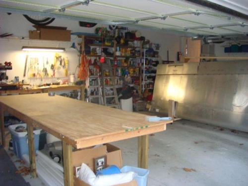 Modified wing storage rack by installing a vertical brace at the mid point. Then took the 4x8' piece of the shipping container top and inserted it on the side of the rack opposite the completed wing. Put the right wing skins in the rack behind the slings. The 4x8 sheet of plywood helps keep the skins straight. Put the right wing nose skin in the sling with one side sticking straight out. Found a bunch of extra sheet material under the wing skins of various thicknesses and sizes.