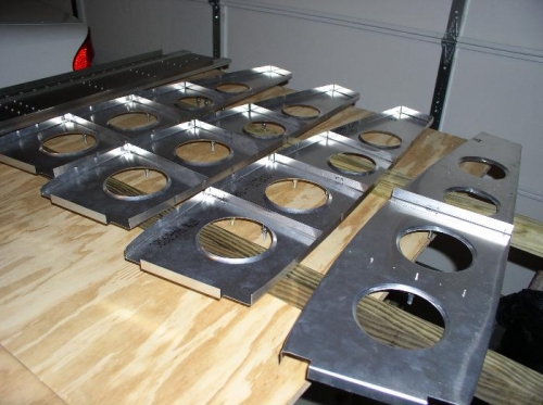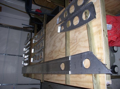 Mounted aileron blocks on Spar 7. Marked channel, cut to size, drilled and clecoed in place. Cut 'L' doublers for Spars 1,2,3,4. Cut 'L' brackets for wing locker Spar 4 & 5. Couldn't find 6 2x2x5' steel stock. Ripped a couple of 2x6's to exactly 2" instead. Used pressure treated lumber, so hopefully they won't warp.