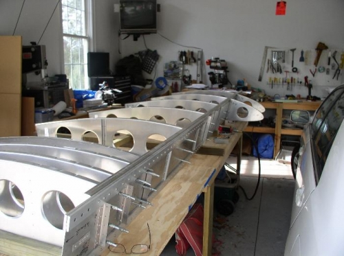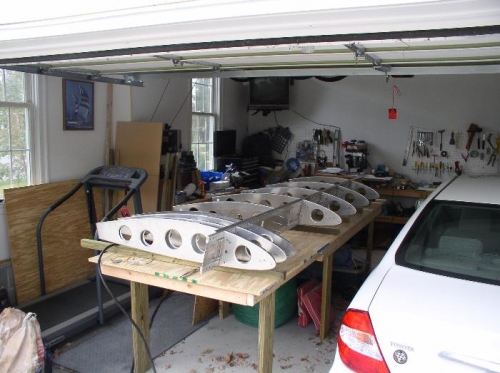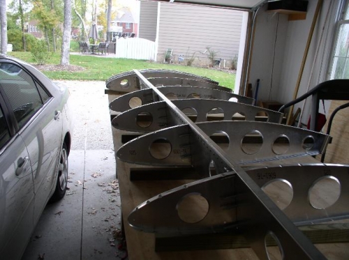 Drilled and clecoed remainder of the nose ribs. Marked and drilled holes in rear channel. Marked and drilled holes in doubler. Drilled and clecoed doubler and hinge doubler to rear channel.My great idea for wood 2x2's vice steel failed. Two warped at least a half inch. Found some 2x3 PVC gutter down spouts that I cut to 4 1/2 feet lengths (5' seems too long). At least they won't warp and they were cheap.
