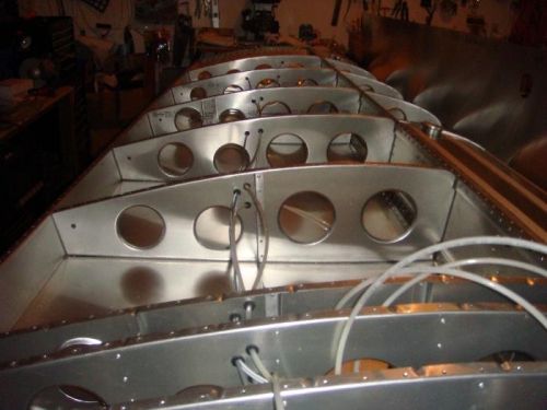 Re-ran wires for nav light and landing/taxi light. Moved aileron trim wing forward to clear aileron control cables (future). Drilled holes for tank vent and quick drain. Screwed up locating holes. Should have made a template. Enlarged holes but still needs work to get tank to sit properly.