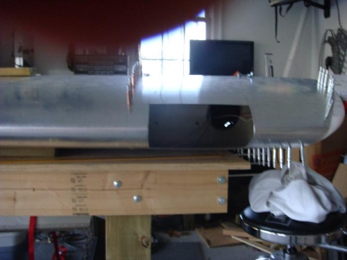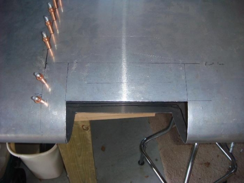 Closed up wing to cut hole for landing light. Verified that fuel fill hole was correctly aligned. Followed landing light installation procedures from Homebuilders.com DVD. Marked opening and rivet line. Verified with clear lens. Made cuts with Olfa knife. Filed to smooth edges. Fitted light bracket in opening and traced edges on inside skin for reference later. Re-opened nose skin.