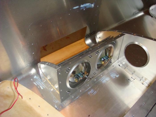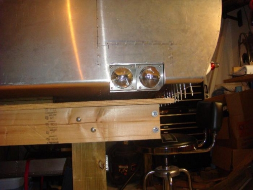 Drilled and clecoed landing light channel bottom in place. Closed nose skin. Marked, drilled and clecoed remaining holes for riblet and channel. Reopened nose skin. Applied anti-corrosioin goop to inside of overlapping areas of nose skin, landing light channel and riblet. Deburred all holes. Riveted riblet to channel, bottom of channel and riblet to nose skin and flange to nose rib. Cut tubing for spacers to hold landing lights inplace and mounted lights in channel. Mounted with tabs on light bulbs on inboard side so lights will angle slightly ro the right. Cut approximately 10mm off of acrylic cover to allow easier fitting through leading edge cut-out.