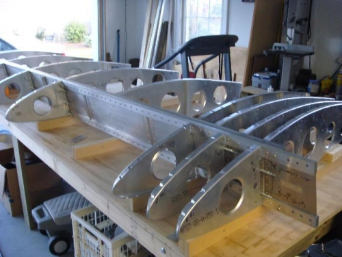Position wing on 2" bars as depicted in photo assembly guide. Set angle of spar at 12 degrees. Positioned and clamp individual nose ribs in place. Drilled and clecoed in place.