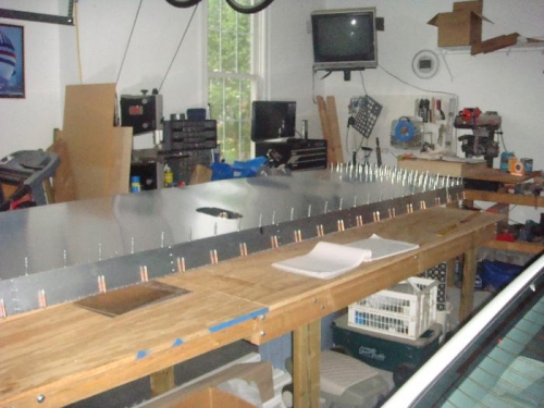 Set wing spar at 9 degrees using engineered 2x2s. Leveled wing. Placed bottom skin inplace. Marked spar locations as described in manual. Checked alignment about 15 times. Drilled holes along rear channel starting from the fuselage end. Rechecked level and angle. Began drilling and clecoing holes for spars starting with Rib #1 and working outboard. Drilled one hole at a time starting at rear channel and working towards spar. Finished Spars 1 thru 4.
