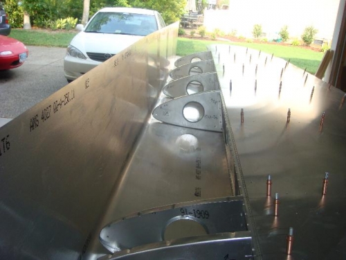 Completed re-assembly with clecos. Marked all 'no-rivet" areas. Riveted spar line first, starting in the middle and workinig in alternate directions. Then riveted main spars working from spar aft. Worked ribs in sequence 1 to 9. Lastly, riveted nose ribs also in sequence. Cut hole for fuel filter access between nose rib 2 & 3. Mounted nut plates on aileron horn access cover. Mounted flap in place with clamps. Then drilled holes in piano hinge, starting in the middle and working outward alternatively. Removed flap and flipped wing rightside up. Clecoed top skin inplace. Laid out straps for working the top side nose skin. Quit for the day.
