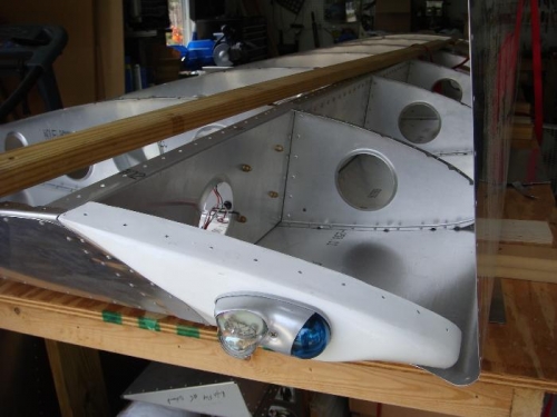 Riveted bottom and aft part of fiberglass wing tip. Riveted navigation light inplace. Connected wires for navigation and strobe lights. Tested with 12V power supply. Fastened fuel tank ground wires to NR #1.