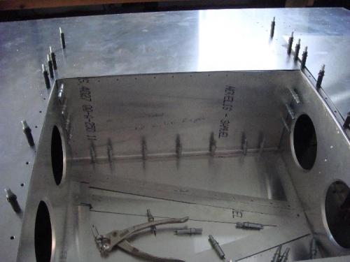Drilled holes in back panel. Filed panel to final size. Cut 'L' piece for top of rear panel. Drilled holes in 'L' brackets and back panel top and sides. Put top skin back on to ensure spars were in their proper place before drilling the holes. Finally drilled holes through bottom skin for back panel.