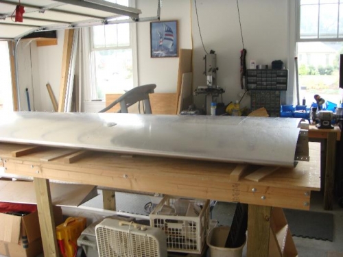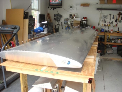 Finished riveting the top skin inplace. Attached the aileron with clecoes. Put wing in rack with left wing.