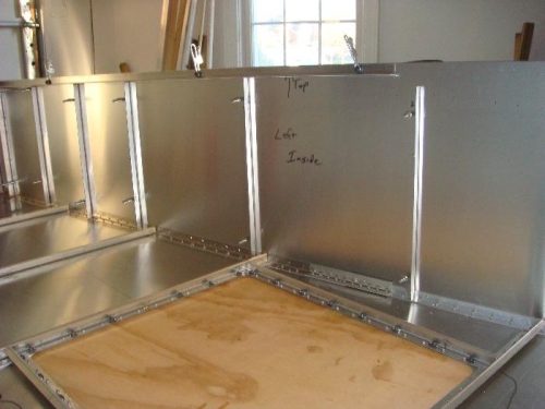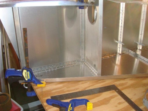 Aligned left skin vertically with forward tip flush with bottom skin and a small tangental alignment at the rear tip. Drilled and clecoed bottom holes starting at rear and working forward. Verified HT frames were square with the upper rear longeron, drilled and clecoed the side skin to the HT frame. Cut 'L' angle diagonal piece and drilled/clecoed in place.