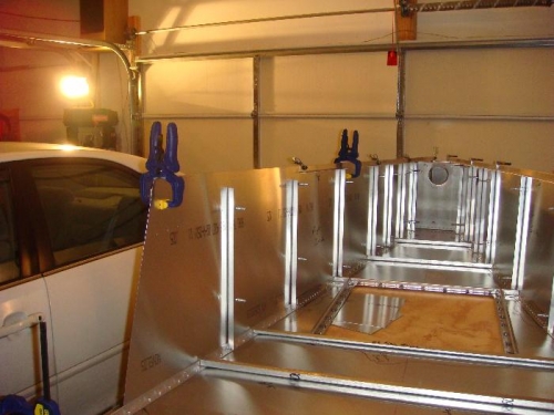 Reconfigured work bench to work the right side. Re-checked right skin horizontal alignment. Clamped upper longeron in place. Aligned vertically and began drilling/clecoing the bottom holes.
