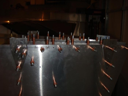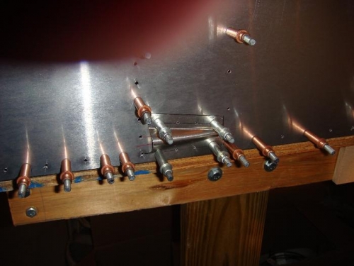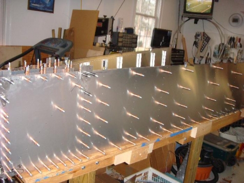 Marked, drilled and clecoed HT attachment brackets in place.