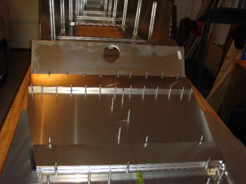 Aligned rear section of fuselage, gear channel and cockpit floor centerlines using a vertical laser level. Once aligned, clamped cockpit floor to gear channel. Drilled and clecoed together starting in the center and moving outward, alternating sides.