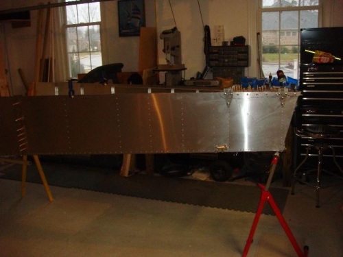 Aligned center wing spar with predrilled holes and marked flange centerline. Drilled and clecoed aft row of holes starting in the center and working out.
