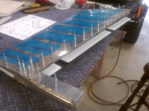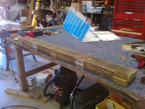 Built a bending brake out of 2x6 and spare door hinges. Made bends on flight control skins. Was nervous about it, but it turned out to nothing more than pressing on the board with my body weight