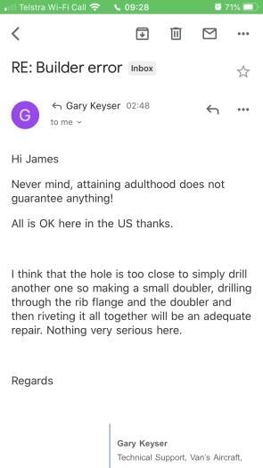 I did manage to not read the instructions properly (in order) at one point and drilled one hole in HS 00005 before I have tensioned it properly on the rear spar which caused the problem in image 2. Quick email back and forth with Vans and they said it is no issue and just add a doubler which I did. It is really hard to even see the mistake with the doubler clecoed into place.