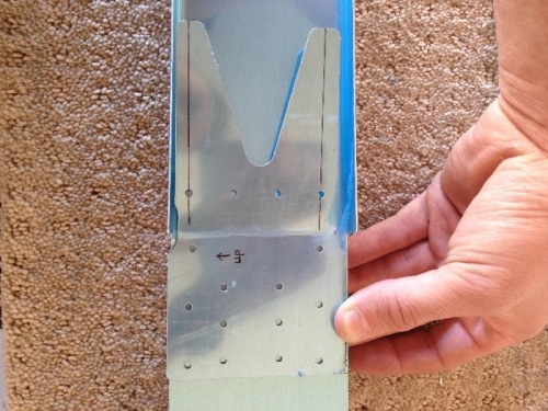 The front spar doublers were seperated (they came as one piece), lined up and match drilled. Parts HS-810-1 and HS-814-1 were prepped and tapered. The front spar also needed to have a 1/4" relief notch drilled out with a unibit. Now came the stressful part! Bending 810 and 814 to a 6 degree aft sweep. This is what gives the sweep for the horizontal stab. The bends were made using wooden blocks, a mallet, and a protractor. In actuality this was really easy. It was a lot more intimidating than it actually was. I was proud of my final angles!