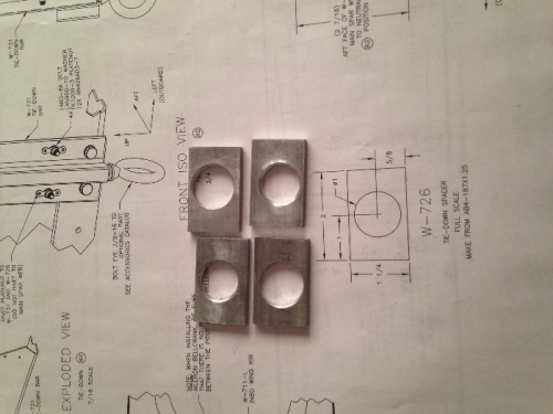 I fabricated the four spacers for the wing tie down assembly. Not as easy as I thought since the spacers were so thick. The unibit struggled to get through.
