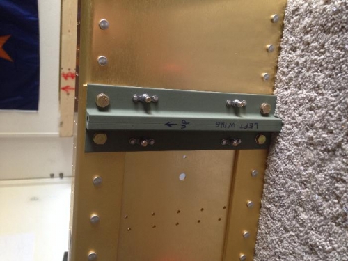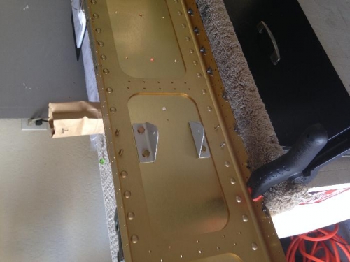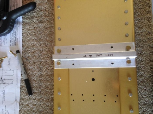 The W-731 tie down bar was drilled per the dimensions on the plans. The one bolt was slipped through main spar and clamped in place with the fabricated spacers. All the holes were then back drilled. Everything was removed from the front spar and then clecoed together as a seperate assembly. The platenut holes were then drilled using a spare platenut. The assembly was then taken apart for edge finishing, deburring, and priming. The platenuts, spacers and the tie down bar were riveted together and then bolted to the main spar with the W-823PP bellcrank brackets with the proper torque values. This process was repeated for the right tie down assembly. At this point the front spar hole that the stall warning wires will run through was enlarged per the stall warning system schematic on the left side only.