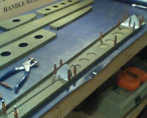 Prepped and primed skin, clecoed main spar to doubler and the six hinge brackets . Ready to start riveting.