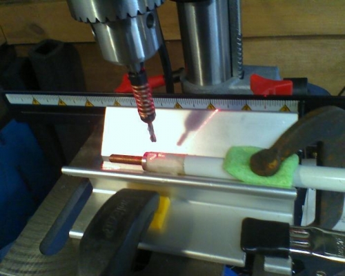 After getting my V jig and boelube I was all set to go , go screw everything up that is. First I should have used a drill punch to start and then use a #40 bit before drilling to final size . The powder coated surface and curve make the bit wander. Also I should have better secured the jig as it moved unknown to me . On my next attempt I forgot to stagger the two rivet holes by .21" . The rod end goes .63" into the tube. The 4-12 are two long and I shortened them to 4-11 Well it was a learning experience . I'll have to call Vans and order all new stuff and try again.
