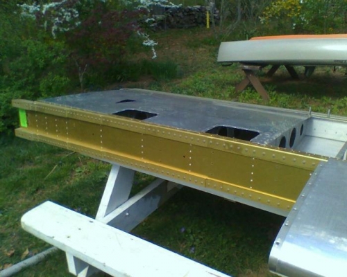 After ordering a new torque wrench from Brown tool I re-installed the right fuel tank and torqued all the bolts to 24 inch pounds. I had to take the wing out of the cradle and lay it on a picnic table and use some large wood clamps to get it alighned properly ( pia ]