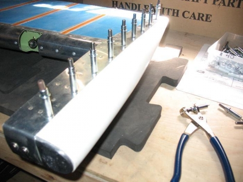Match drilled and clecoed end cap . Next I will dimple skin and countersink fiberglass.