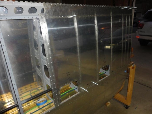 Yesterday Don and I contiued riveting the bottom left inboard wing skin. I was having a hard time keeping the bucking bar straight so I used the back rivet set as a bucking bar. I had seen this on another builders web site. I used a wood block as a handle instead of steel. This rig became very handy, especially when working around the nut plates on the spar. Also less likely to do damage if dropped. We still had a few minor smiles where I had slipped with the normal bucking bar. This skin is taking so long because I have to inspect every rivet with a flashlight and mirror.