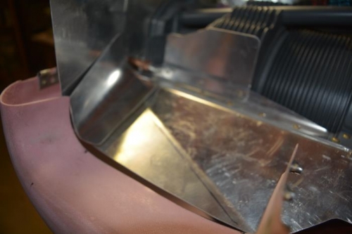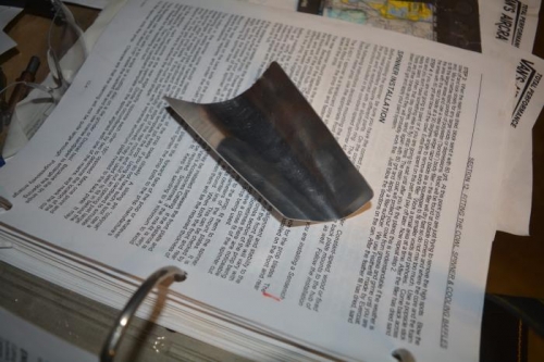 I spent lots of time studying the plans for how the baffles are to be trimmed. The pieces in the kit are very oversized and their shape confused me. I had to seek some advice from the Van's Airforce Facebook page. I then was able to understad what the finished product should be. The forward ramps have been trimmed and bent.The side baffles have also been trimmed and the bottom tabs bent. I was then able to move on to the conicle bend. The plans say to "lay out the pattern on a oversize piece of .032 sheet. You can't get enough leverage to make the bend on after you cut the pattern.