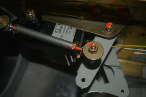 I started to install the roll servo when Ron Sutton came by the hangar. He offered to help install the right wing so we did that. I then finished insalling the roll servo. Speaking of Ron, he makes a neat lighweight towbar setup. It requires changhing to a hollow axle bolt in the tailwheel. I installed the bolt and new bearings. Both wings are now on, plumbing is done and wing wiring is pulled