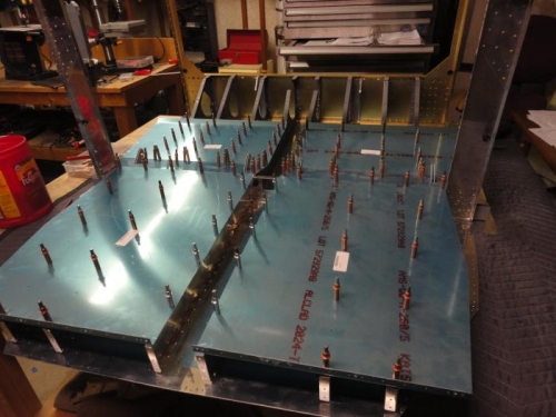 I had not done anything on the project all week. I needed Don to come over and help with riveting . We finished the bottom skin to the center section. Then we started lining up the floor panels. I had to make a modification where a seat rib meets F-705. I had done damage where a mistake led to an improperly drilled out rivet. I made a decision to drill the hole, which once held a rivet, to accept an AN3 bolt. I also had to open holes in F-742-R to clear the seatbelt mounts.The left side is fine.By the way, I went up to fly the club Archer last night, right at sunset. The last two landings it was getting dark. I have not flown at night in thirty years. I had forgotten how fun it can be.