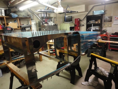 I finished the right longeron today and cut the slots for the F-711 bars. I clamped the longerons in place and flipped the aft section. Then joined the center and aft section. Check out the picture to see what I used to cut the slots in the longeron. I could not find my cutting disc so I improvised, adapted and overcame. It worked out great!