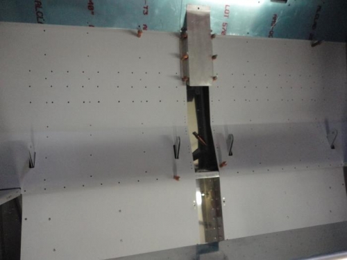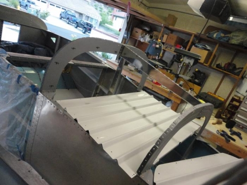 I have been prepping several interior panels for paint. I have some pieces primed. I spent alot of time on the foward tunnel cover. I had it nearly completed but the last two rivets had to be bucked instead of squeezed. I slipped with the gun and put a big ding in the cover. I wish I had a before photo because I managed to work the ding out. I also started to mask some interior pieces that have already been installed in the fuse. I will be glad when the interior paint is done as it is really slowing the project.