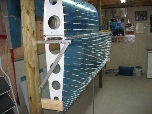 The left wing leading edge and top skin were match drilled to the left wing skeleton. My wife Meta generously donated her time to help move clecoes during the match drilling process.
